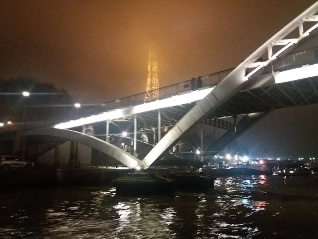 1. Dans le cocon du brouillard, la Tour Eiffel brille de tous ses feux d'avoir pondu un bel oeuf rouge