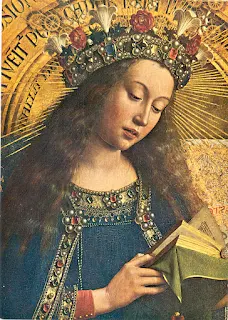 Extrait du retable de l'agneau mystique, Marie et l'annonciation, XVe https://fr.wikipedia.org/wiki/L%27Agneau_mystique Hubert et Jan Van Eyck, L'adoration de l'agneau, env.1432, Gant, Belgique, Eglise de St. Bavo https://udayton.edu/imri/mary/i/images-of-the-madonna.php