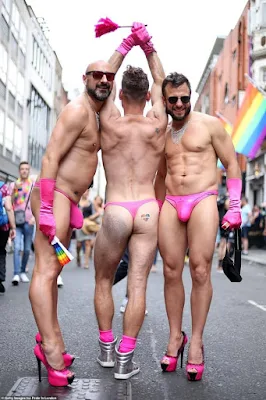 Le web se trouve globalement expurgé des photographies de virilités tendancieuses afin de refaire une beauté aux marches de féroce fierté ? Lorsque en 2015, j'ai commencé innocemment ma recherche, celles-ci étaient majoritaires. Ce n'est plus le cas mais cela ne signifie pas que la virilité y serait moins dominatrice ou triomphante. La phallophorie s'y exhibe toujours, malgré la présence grandissante d'enfants dans le cortège et parmi les spectateurs (l'orga de Londres compte tout le monde dans le même sac, 30 000 pour démontrer sa popularité- ?) Mais tout ceci est-il bien populaire ? Fétichistes du slip, fétichiste du masque canin sadomaso, vous aurez le choix.